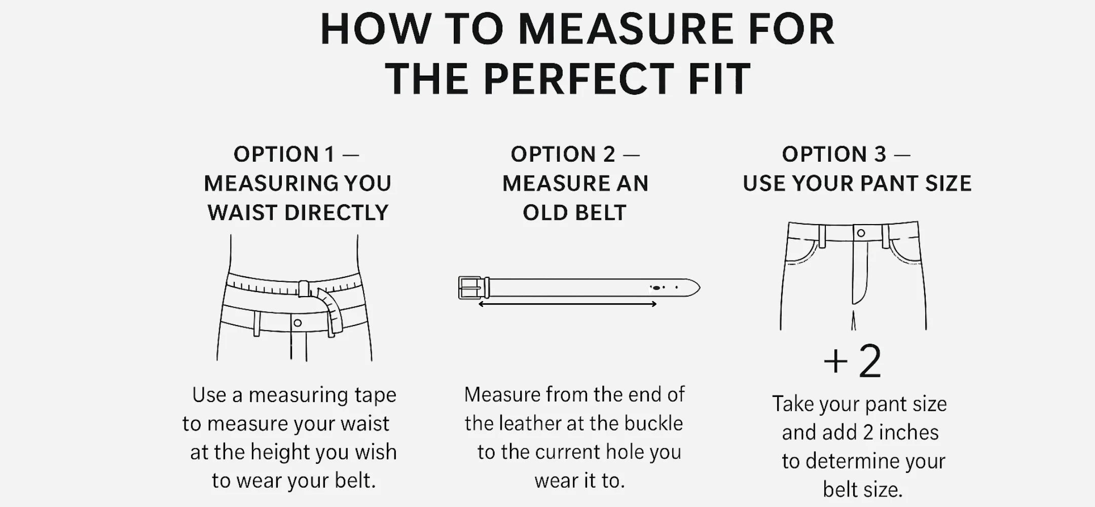 To find your correct belt size, measure around your waist or hips with a dressmaker’s tape where you normally wear your belt — this measurement in inches is your belt size. You can also measure an existing belt from the base of the buckle to the hole you use most often for an accurate result. If you’re unsure, a quick rule of thumb is to take your pant size and add 2 inches.